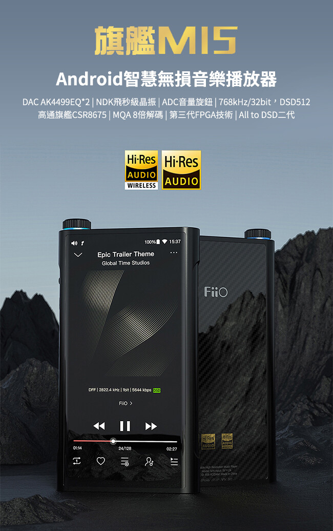 支援 DLNA、AirPlay、WiFi 傳歌功能,支援 FiiO Link,可通過手機智能遙控 M15,可以一鍵定位當前播放曲目、卡拉 OK 式播放清單管理、按兩下喚醒螢幕、三指下拉截螢幕。